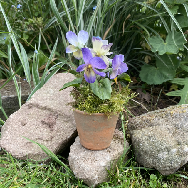 Violas in your chosen colour in a terracotta pot with leaves and moss. Each Viola has 5 petals. All Charlottes flowers are handmade from crepe paper, painted in artist oils and then finally dipped in a coat of wax.